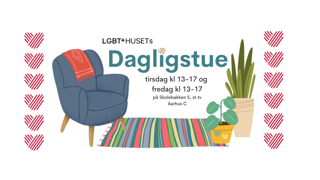Dagligstuen drives af frivillige i LGBT+HUSETs, og vi glæder os meget til at invitere jer indenfor tirsdage og fredage kl. 13-17.